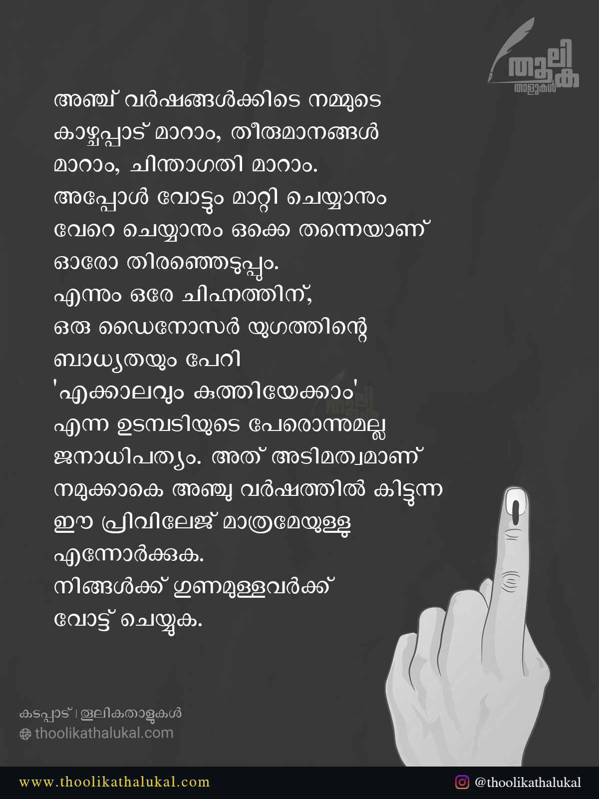 എന്നും ഒരേ ചിഹ്നത്തിന്, ഒരു ഡൈനോസർ യുഗത്തിന്റെ ബാധ്യതയും പേറി എക്കാലവും കുത്തിയേക്കാം എന്ന ഉടമ്പടിയുടെ പേരൊന്നുമല്ല ജനാധിപത്യം
